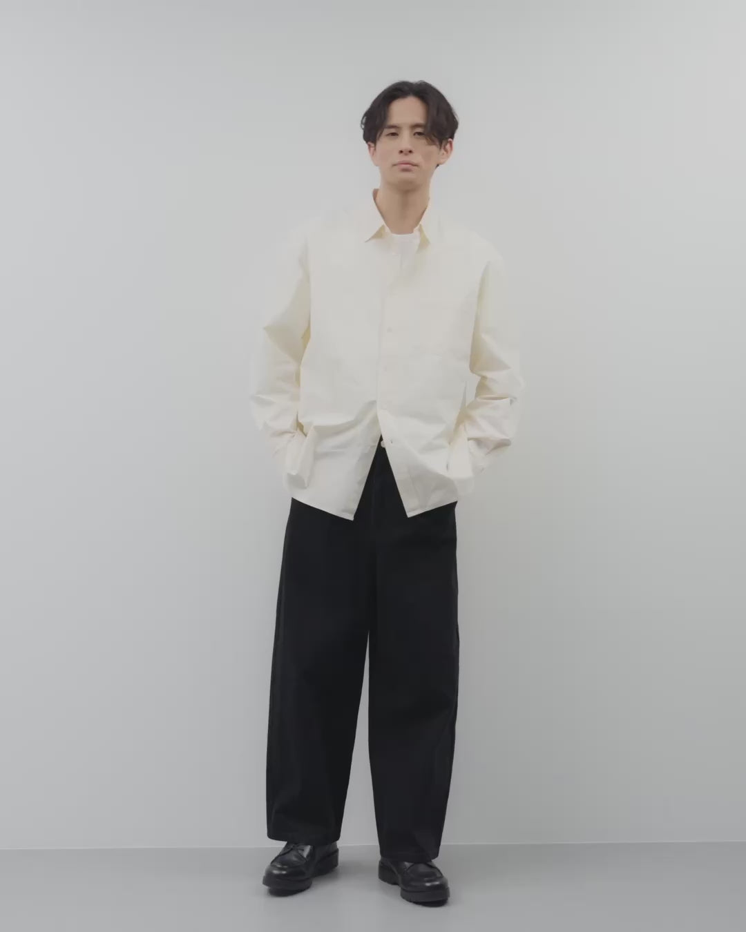 シャツ以外をブラックで統一することで アイボリーの柔らかいイメージを 引き締める、メリハリをつけたコーディネート。 -