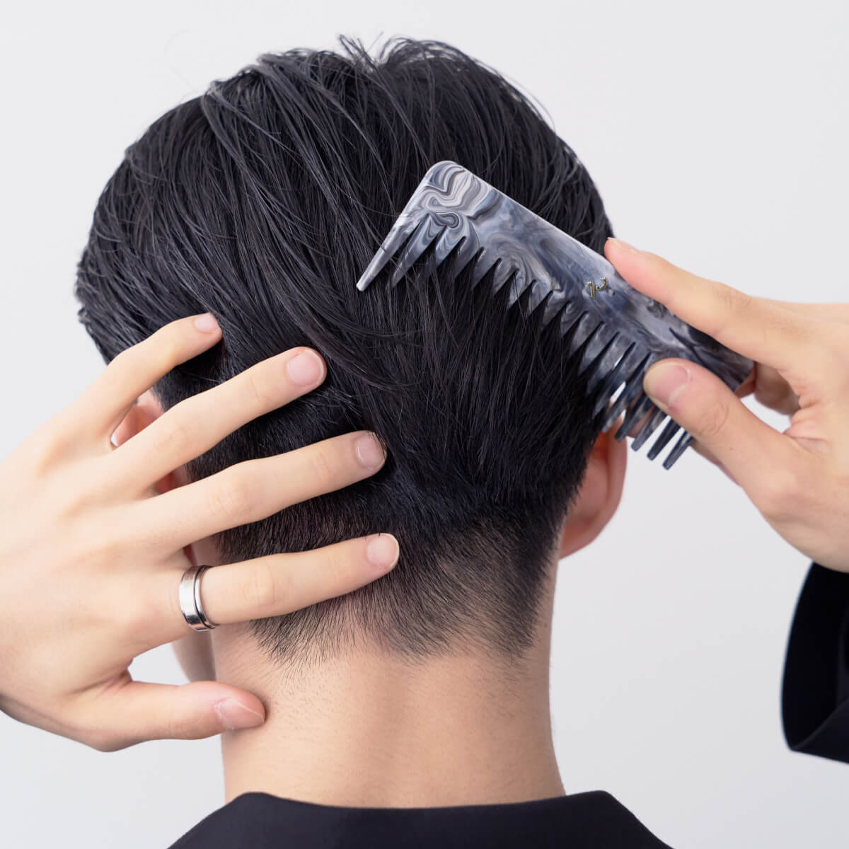 ヘアワックスと同じように手に伸ばして髪に馴染ませるだけで、簡単にヘアセットが可能。適量は、第一関節ほどが目安。上げスタイルは、最後にコームで整えるとより綺麗な仕上がりに。