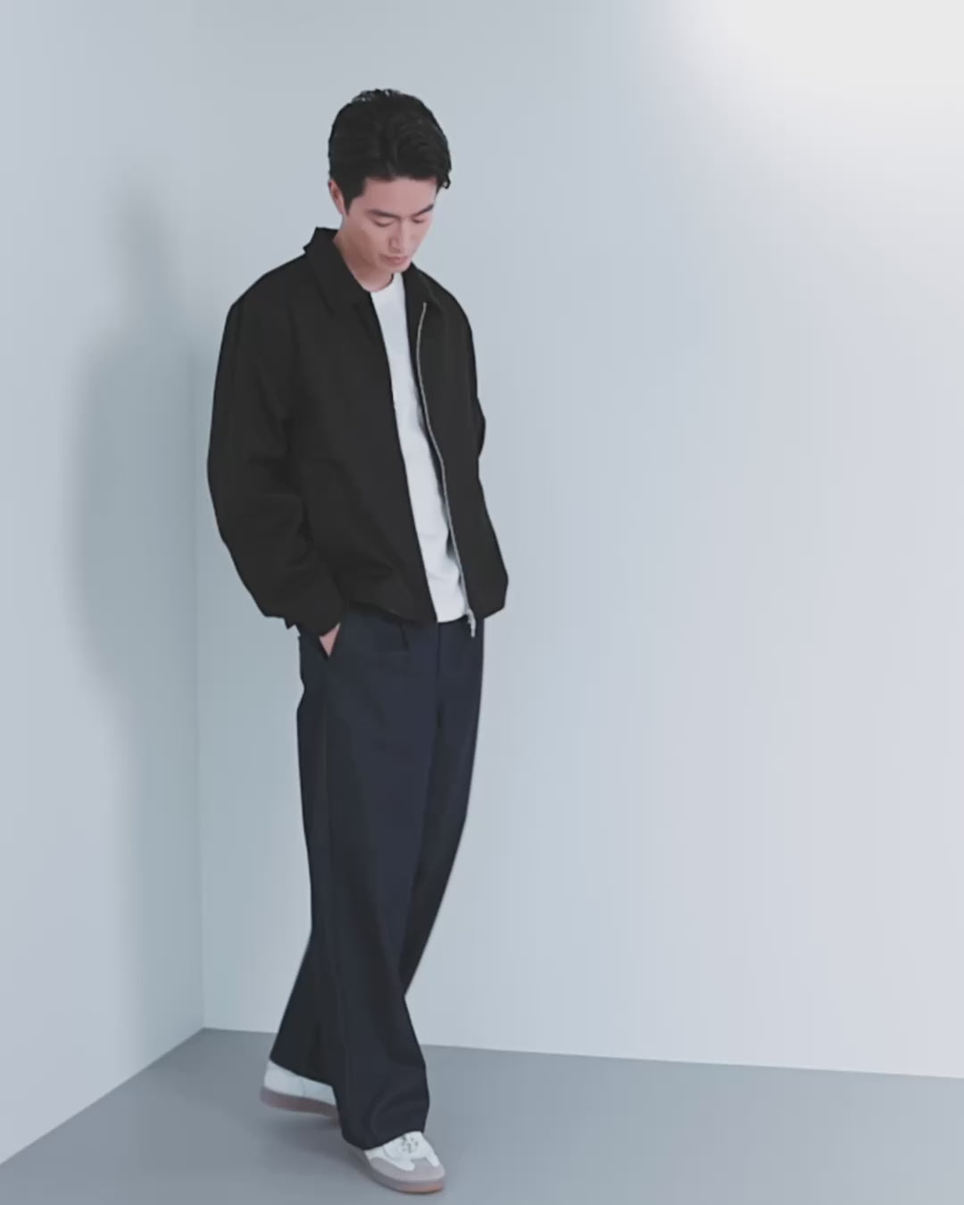 シルエットは裾まで自然に落ちるワイドストレート。深めの2タックを取り入れ、腰まわりにゆとりを確保。