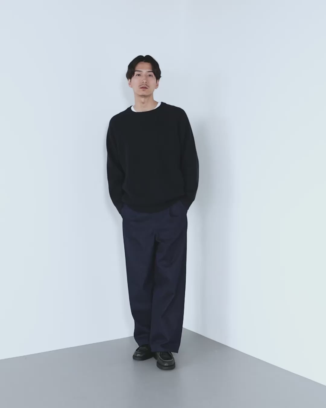 大人の冬スタイルにラフさと品を添える、クルーネックニットです。