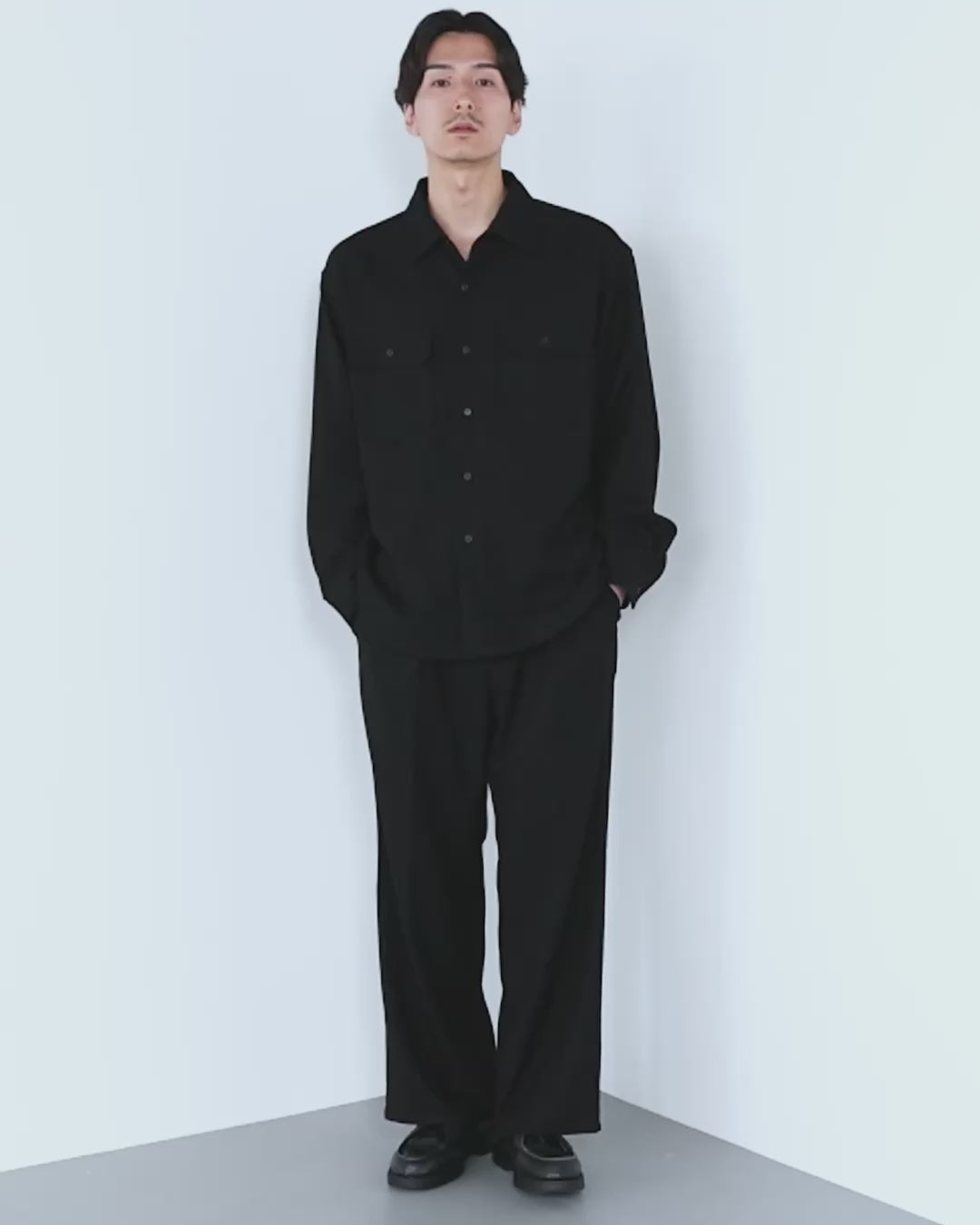 同素材のスラックス『2Tuck Wide Wool Touch Slacks -black-』とのセットアップ着用が可能です。
