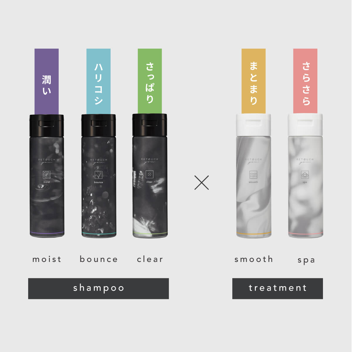 人によって異なる毛髪・頭皮の悩みは、毎日のヘアセットがうまくいかない原因にも。レタッチでは、個性あるシャンプー3種類・トリートメント2種類を用意。あなたに合ったシャンプー・トリートメントの組み合わせで、悩みを解決に導きます。