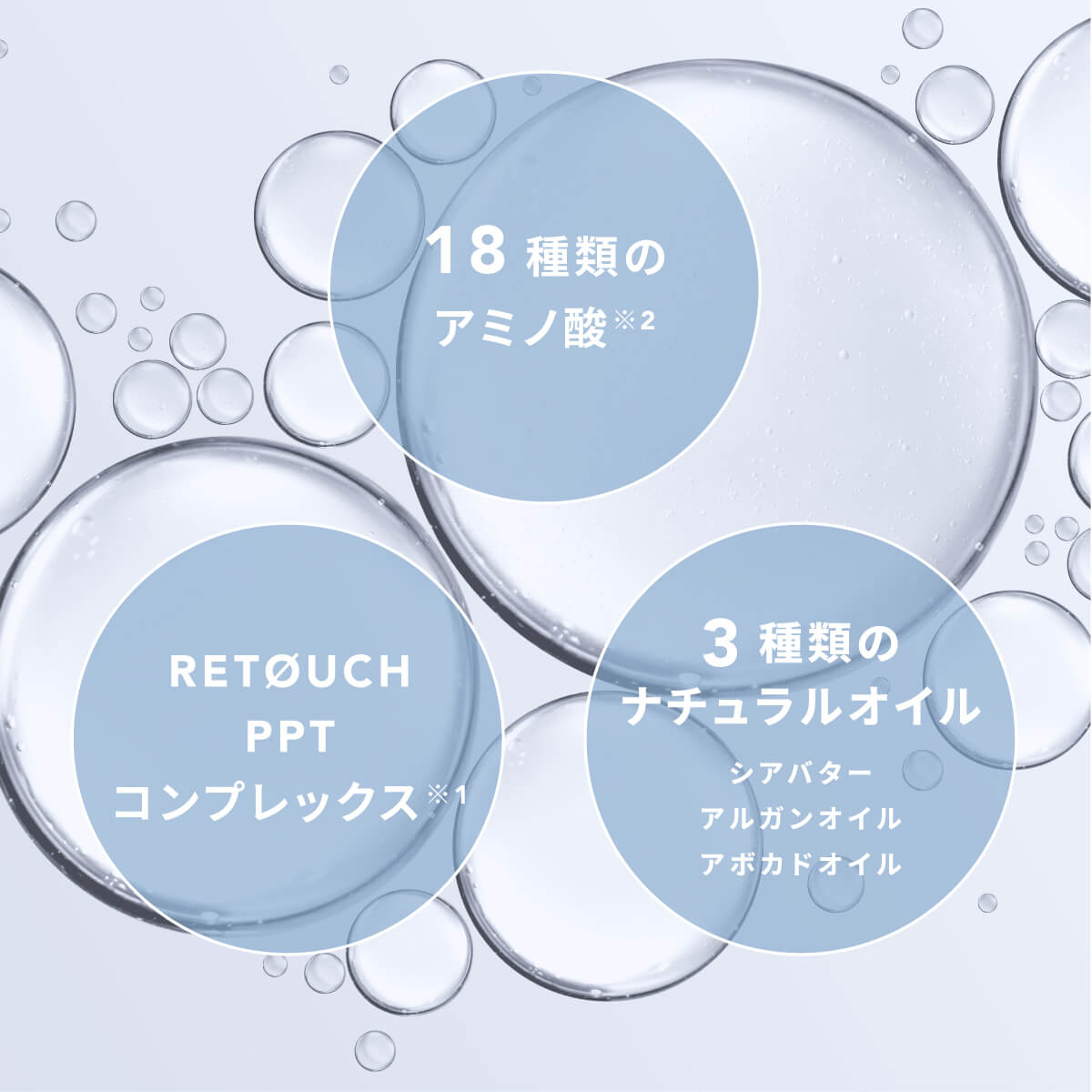 毛髪に必要なタンパク質を構成する、独自成分の「RETØUCH PPT コンプレックス※1」と「18種類のアミノ酸※2」の2つの要素。加えてシアバター、アルガンオイル、アボカドオイルの3種類のナチュラルオイル。この3つの要素をシリーズ共通で配合しています。